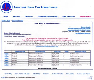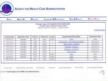 My Grandfather Home Care se fundó en 2004, a partir de esa fecha hemos recibido las inspecciones anuales por la Agencia estatal AHCA, éstos son algunos resultados de dichas inspecciones. Como se puede observar mas del 96 % nuestro centro fue evaluado sin señalamientos. Lo cual refleja nuestro esmerado atención y cuidado a nuestros residentes.